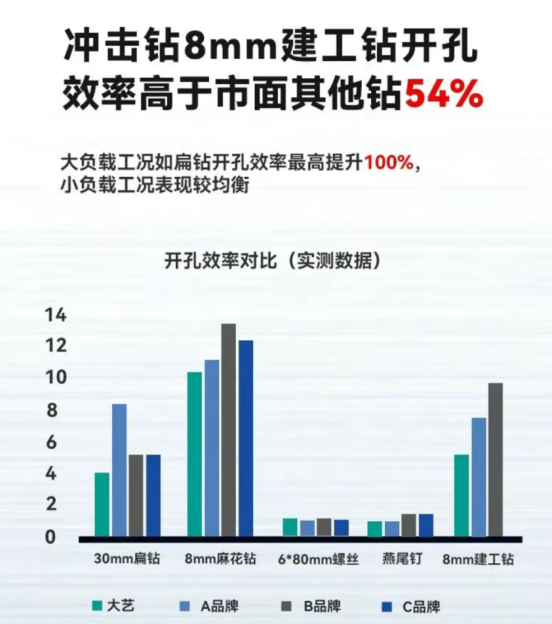 在效率方面,A7Pro 1365i的表现同样亮眼。根据中国CNAS L20664实验室的数据,其8mm建工钻开孔效率比市面其他钻高出54%,在大负载工况下,如扁钻开孔效率提升最高可达100%,即便是小负载工况,也能保持均衡稳定的表现。