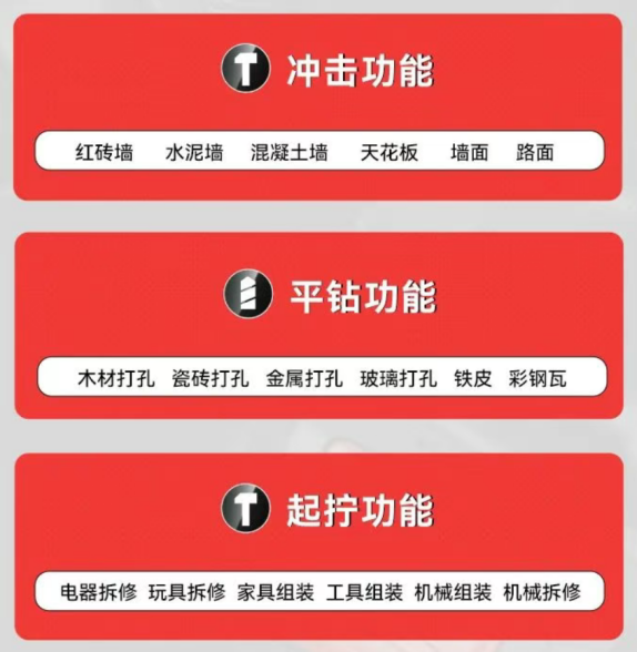 在不同的作业场景下,A7Pro 1365i支持一键切换,实现冲击、平钻、起拧螺丝三种功能的快速转换:冲击功能适用于红砖墙、水泥墙、混凝土墙等坚硬表面的打孔;平钻功能可轻松应对木材、瓷砖、金属、玻璃等材质的钻孔需求;起拧功能则能胜任电器拆修、家具组装、机械维护等工作。双速调节设计更是锦上添花,1挡扭力可达65左右,低速适合起拧螺丝,2挡扭力可达30左右,适用于高速钻孔,匹配不同的作业需求。