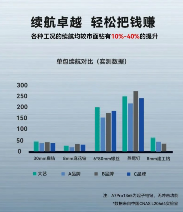 除了性能表现,续航能力也是锂电工具的关键指标之一。A7Pro 1365i在这方面同样不逊色。根据中国CNAS L20664实验室的实测数据来看,大艺A7Pro 1365i在各种工况下的续航较市面钻提升了10%-40%,足以满足长时间作业的需求。同时,A7Pro 1365i采用A7Pro平台电池包,支持电池共享,进一步提升了用户的使用便利性。