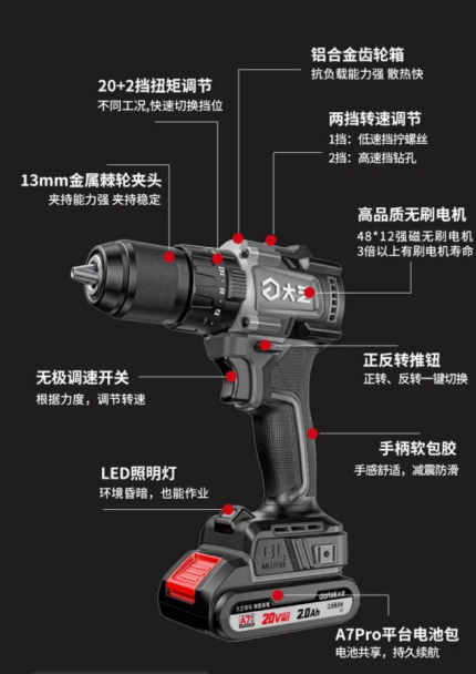 在细节设计上,A7Pro 1365i同样体现了人性化考量。13mm金属棘轮夹头夹持能力强且稳定,确保了钻头安装的牢固性;正反转推钮让操作更加便捷,可根据需求快速切换转向;无极调速开关能根据操作力度调节转速,实现精准控制;手柄软包胶设计提升了握持的舒适度,兼具减震防滑效果;LED照明灯则解决了昏暗环境下的作业难题,让操作视野更清晰。其1.0kg的净重和157mm的短机身设计,不仅减轻了作业时的手部负担,还能在狭窄空间灵活操作,适应各种复杂作业环境。