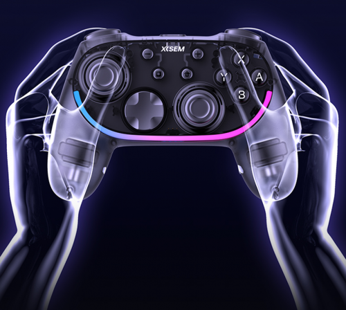 西圣GC1配备内置RGB氛围灯带,支持10种可调模式,并通过智能算法实现光效与操作、震动的同步,营造沉浸式电竞氛围,无论是夜间游戏还是直播展示,都能让手柄视觉表现超越同价位产品。同时,GC1 在蓝牙模式下支持远程一键唤醒 Switch 主机,操作便捷,进一步提升跨平台体验。续航方面,内置1200mAh 电池可提供长达12小时的持续使用,搭配经过500万次敲击测试的机械ABXY 按键和500万次机械霍尔摇杆,确保长期使用手感始终如一。