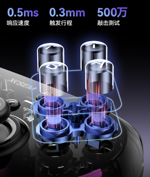 同时,ABXY按键采用机械级微动结构与精密回弹设计,触发行程仅约0.3mm,响应速度低至 1ms,并通过500万次敲击测试保证手感一致。配合可编程宏功能,玩家可一键录制连招或组合操作,实现硬件速度与软件智能的双重加持,让操控更快、更稳、更自由,在百元价位中,这套按键系统实现了专业电竞级操控体验的越级表现。