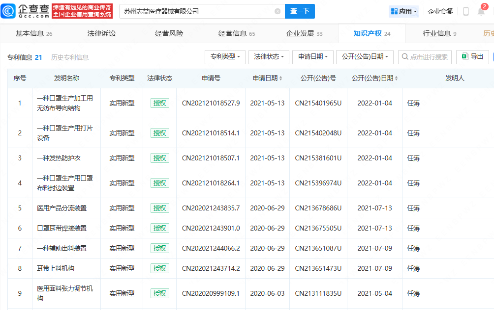 据企信网,苏州志益2024年工商年报显示,张丽芹、任志华夫妇对其各持股50%,分别认缴/实缴注册资本500万元。苏州志益的主营业务活动许可项目涵盖第二类医疗器械的生产等。企查查显示,苏州志益持有“一种发热防护衣”、“医用面料张力调节机构”等实用新型专利,多项专利的唯一发明人均为任涛。