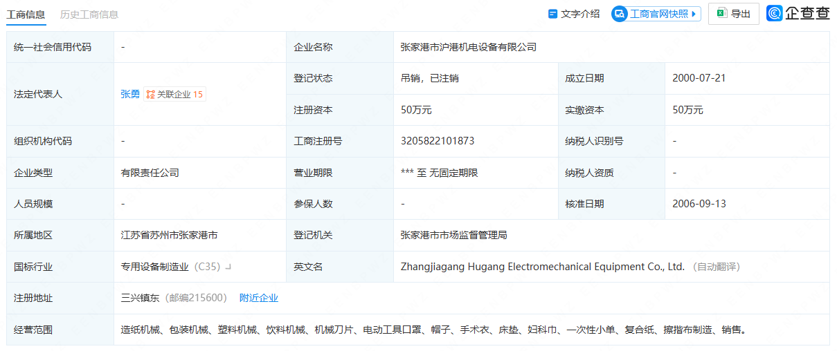 招股书披露,张勇、张利芳兄弟共同投资30%的上海浩大机械有限公司于2001年已吊销,未注销。任涛父母(即张勇姐姐、姐夫)分别担任董事长、董事、总经理的张家港欧科医材有限公司目前经营状态为吊销,未注销。任涛父亲担任总经理的张家港志益卫生用品有限公司目前经营状态为吊销,未注销。