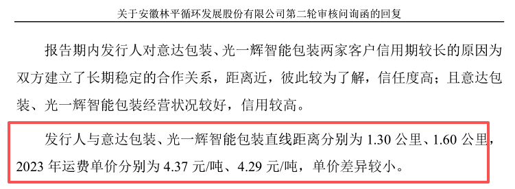 据首轮问询回复,2023年度意达包装的运费单价为4.35元/吨,光一辉包装运费单价为4.41元/吨;但在二轮问询回复中,2023年意达包装的运费单价变成了4.37元/吨,光一辉包装的运费单价变为4.29元/吨。