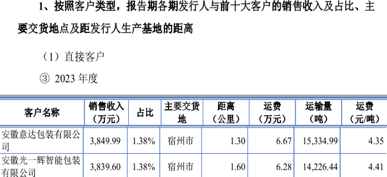 林平发展两名客户安徽意达包装有限公司(下称:意达包装)、安徽光一辉智能包装有限公司(下称:光一辉包装)的2023年运费数据在不同文件中出现矛盾。