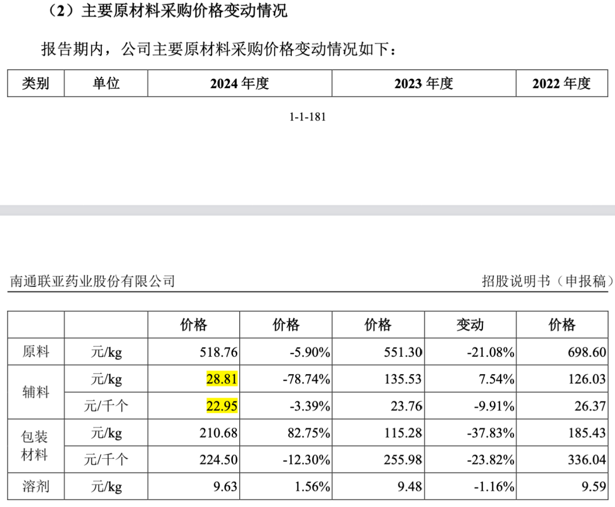 另联亚药业在成本采购价格披露上的不一致,也为其信披真实性、准确性划上问号。招股书(P181)显示,2024年度联亚药业辅料采购规格分为按重量和数量两种计量方式,价格分别为28.81元/千克、22.95元/千个。