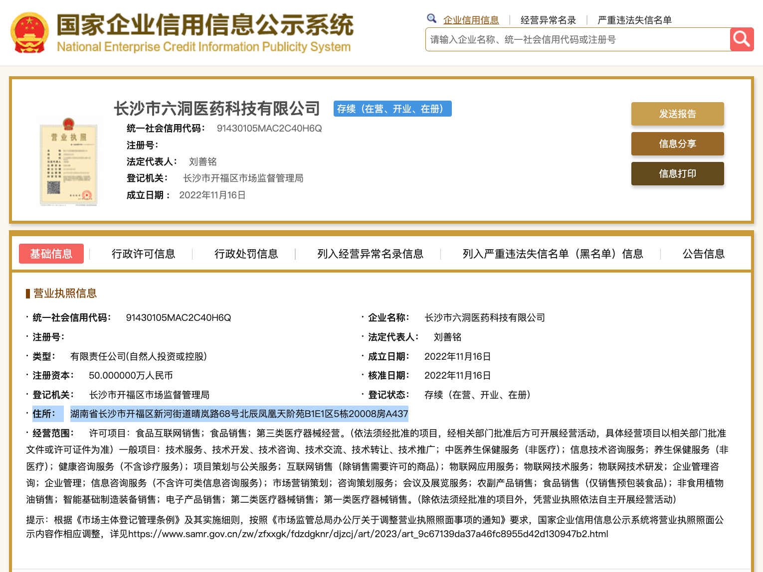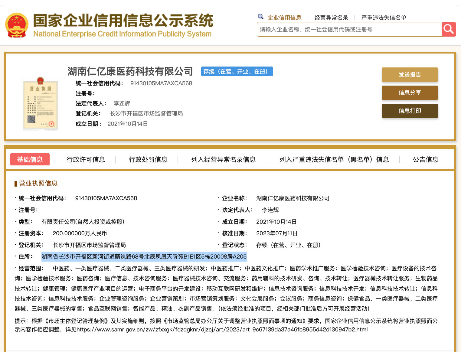 此外,据企查查与企信网,联亚药业的推广服务商中,湖南仁亿康医药科技有限公司与长沙市六洞医药科技有限公司分别成立于2021年10月、2022年11月,后者股东李连辉与前者法定代表人同名。同时据2024年工商年报,这两家公司的通信地址均位于长沙北辰凤凰天阶苑同一楼栋,二者共享联系电话185*****961,当年度年社保缴纳人数分别为5人、3人。