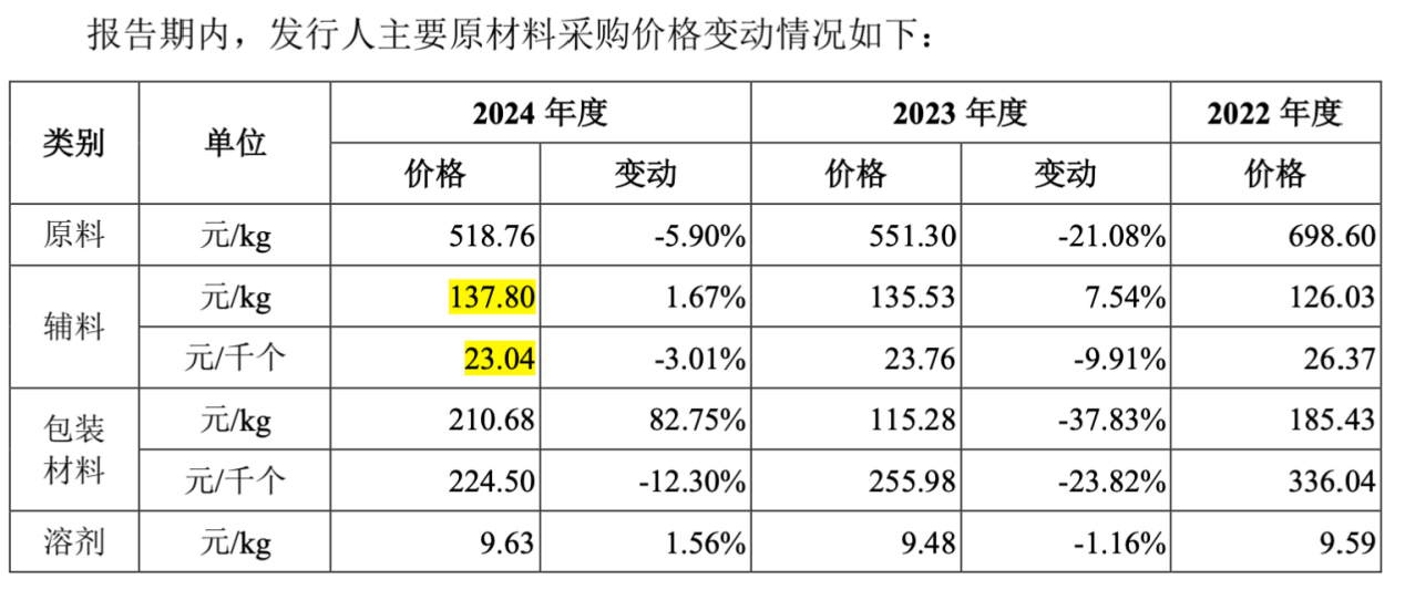 但在首轮问询回复(P161)中,2024年公司的辅料采购价按重量计飙升至137.8元/千克,按数量计微增至23.04元/千个,2022年和2023年的数据则一致。关键成本数据的显著差异,有待公司和保荐机构进一步给予解释,这也关系到其信披工作质量的成色到底如何。