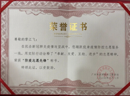 2020年,黎江飞主动请缨加入防疫志愿服务。他协助社区完成核酸检测、物资配送、防疫宣传等工作,经常从早到晚坚守一线。凭借突出表现,他被授予“防疫志愿先锋”称号。他说:“我是党员,也是退伍军人,这时候不站出来,什么时候站出来?”