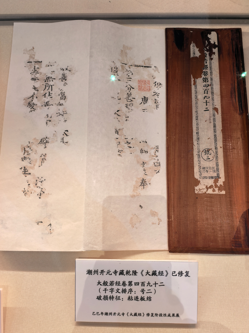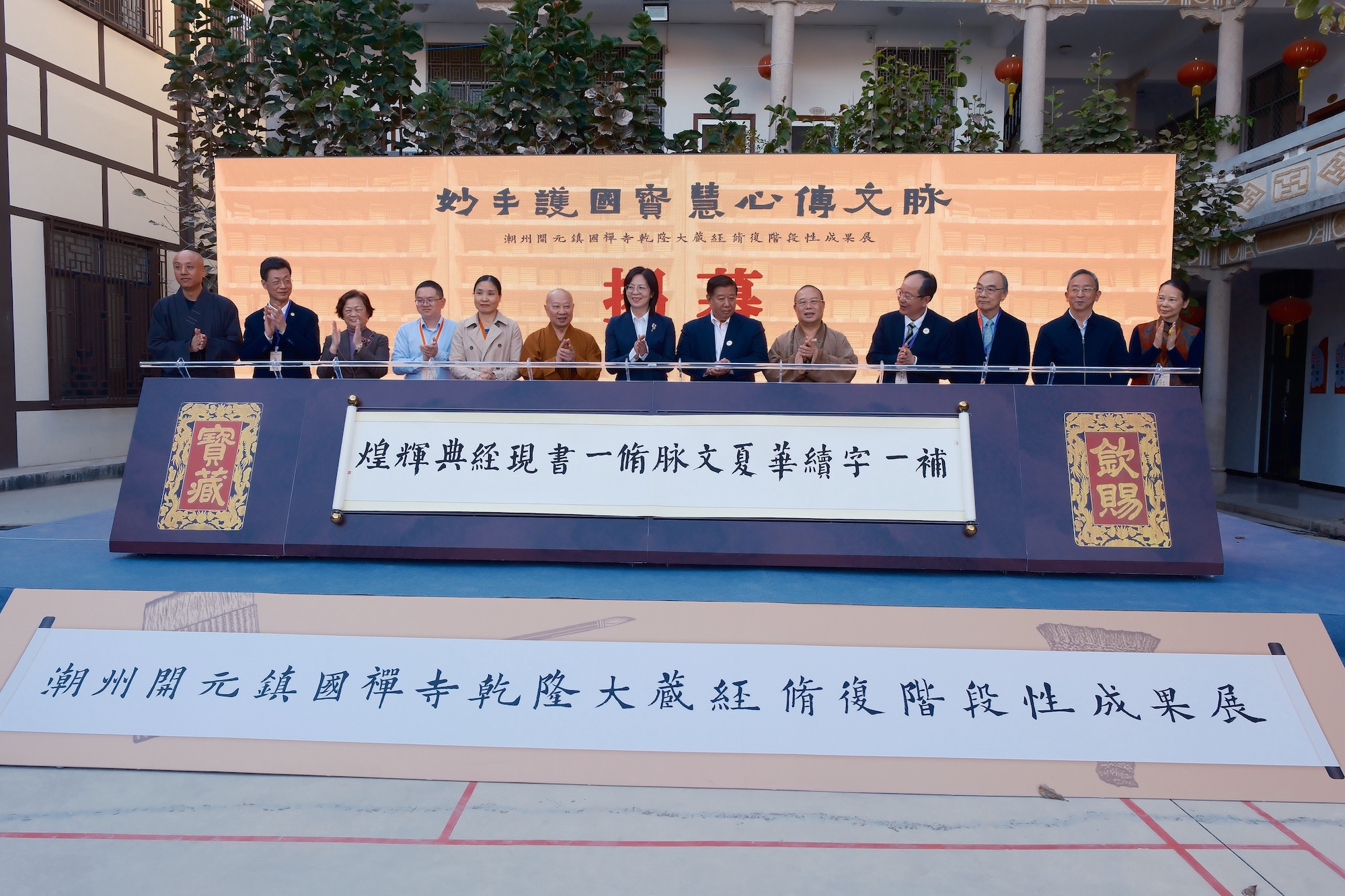 乾隆版《大藏经》修复成果展,11月29日在广东潮州开元镇国禅寺开幕,这是国内首次对《大藏经》规模化修复成果的集中展示,也是开元寺藏乾隆版《大藏经》首次向社会公开展示。正在潮州参加第23届国际潮团联谊年会的代表,有关文博机构、佛教界和学术界的代表等齐聚开元古刹,共同见证典籍重光。展览由国家图书馆(古籍保护中心)、广东省立中山图书馆(古籍保护中心)主办,潮州开元镇国禅寺和潮州市图书馆(古籍保护中心)承办,展览将持续到2026年1月3日。