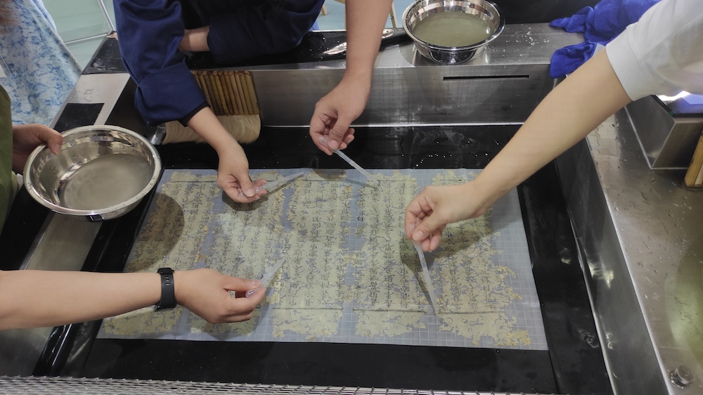 修复团队遵循“安全第一,最小干预”的原则,综合运用传统手工滴补与现代纸浆补书机等技术,针对虫蛀、絮化、板结等病害实施精准修复,并成功攻克前期修复未能解决的书叶深度虫蛀、粘连等复杂问题。截至2025年11月,三期共完成121册、12000余面《大藏经》的修复工作,整体效果稳固。