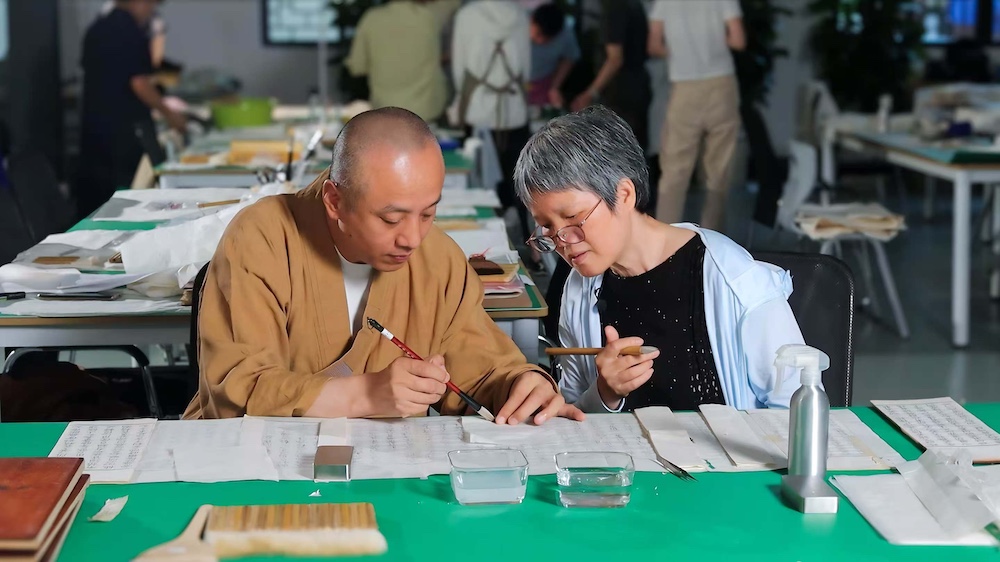 自2024年10月至2025年11月,国家古籍保护中心连续举办三期“全国古籍修复技术与工作管理研修班”,在杜伟生、万群、刘建明、胡玉清、肖晓梅、许彤、朱振彬、薛继民等多位国家级古籍修复非遗技艺传承人及导师全程指导下,汇聚全国28家省级图书馆和2所博物馆,8所高等院校图书馆,以及香港特别行政区康文署文物修复办事处、辛亥革命纪念馆等百余位修复师参加了《大藏经》修复。修复师中年龄最小的26岁,最大的73岁,还有万群、郝婧母女两代修复师同场参加修复,这既是古籍修复事业的专业传承,也是中国传统文化的薪火相传。