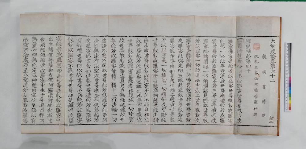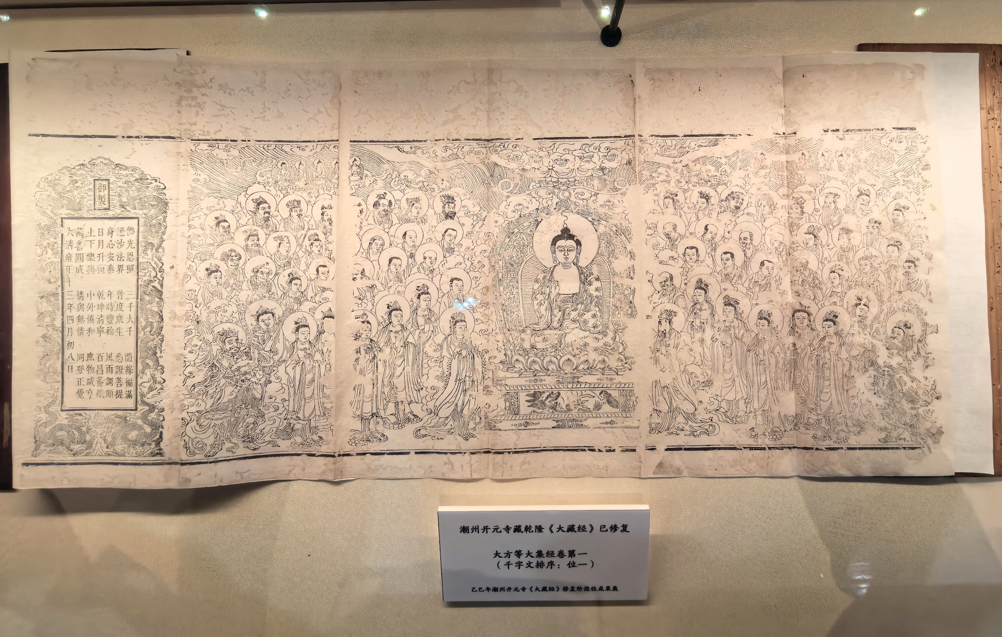 乾隆版《大藏经》的修复与展出,是中华古籍保护体系的一次重要实践。潮州开元镇国禅寺所藏乾隆版《大藏经》,为乾隆年间三次撤毁经板后仍保存较完整的初印百部典籍之一,也是后世补刊的重要底本。开元寺不仅完整保留了《大藏经》7240卷全藏,还有原装经书函套,清朝和硕亲王为开元寺《大藏经》题写的《万德庄严》匾额,以及8个原始藏经大柜。