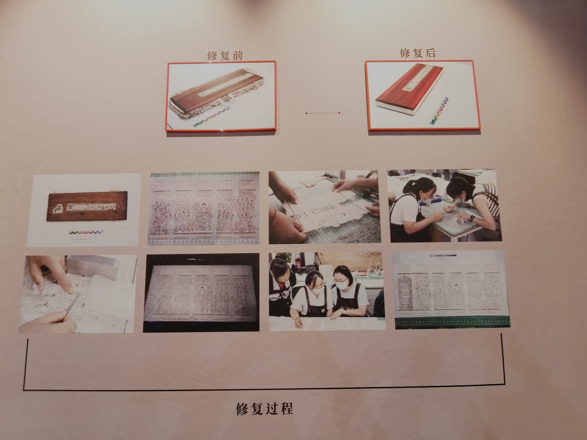 此次展览,将修复成果集中展现,包括破损和修复后的《大藏经》实物,修复选用纸张,修复《大藏经》的残片、褙纸、虫屎,修复工具,纸浆补书机等,展览现场还有《大藏经》藏经柜、清朝经书木刻版等。