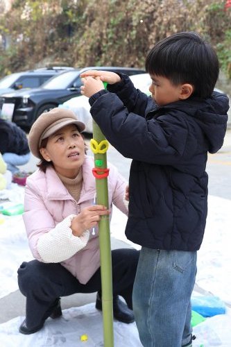 本期活动以“竹”与“黏土”为媒介,将环保行动升华为一场低门槛、高互动的社区美育实验。那些挺拔的竹竿,在居民的协力下深植土中,构成一片错落有致的骨架森林;而那些柔软缤纷的安全黏土,则在孩童的幻想、长者的巧手中,被捏塑成灵动的动物、绽放的花朵、抽象的符号,为竹节披上彩衣,为大地增添画卷。麻绳与藤蔓蜿蜒缠绕,回收塑料瓶改造的“空中花盆”悬于竹梢,多肉植物点缀其间,共同完成了一场从质朴材料到灵动景观的生态蜕变。