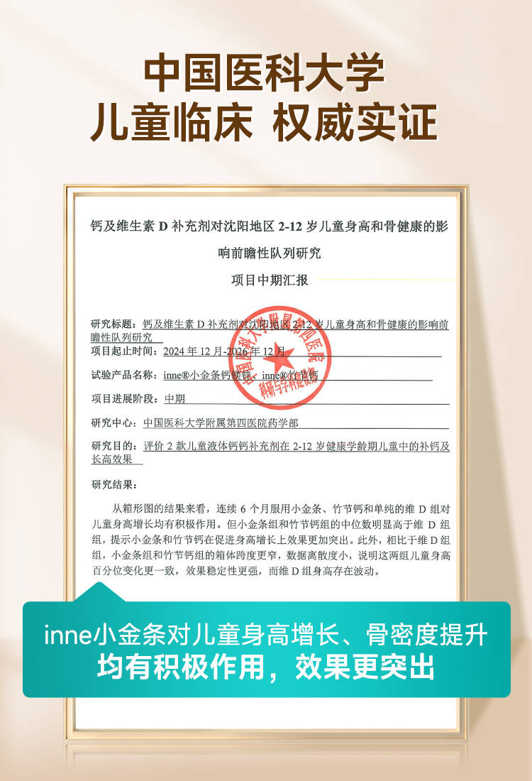 据悉,该临床研究自2024年12月启动,由中国医科大学附属第四医院副教授张又夕团队负责,inne小金条钙镁锌和竹节钙作为钙补充剂,与单纯维生素D补充组进行对照,定期监测身高、骨密度、血清钙等相关指标。